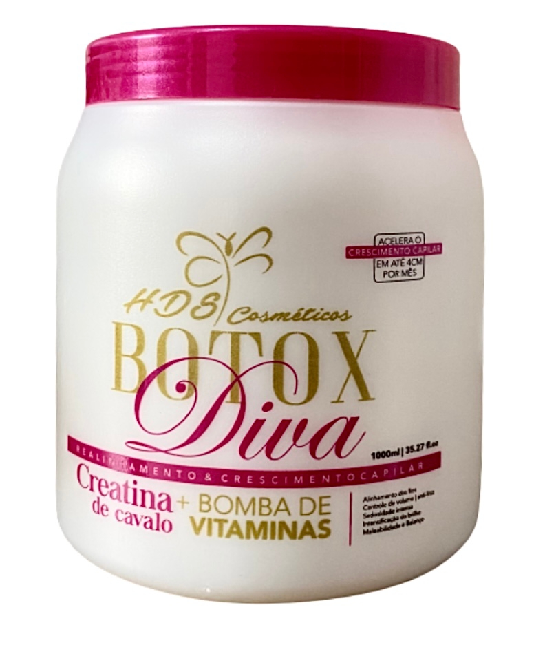 Botox DIVA Creatina de Cavalo - Realinha os fios mantendo o movimento natural. Sua fórmula contém componentes que além de hidratar e deixar um liso perfeito, estimulam o crescimento dos fios em até 4 cm por mês, através da Creatina de cavalo.